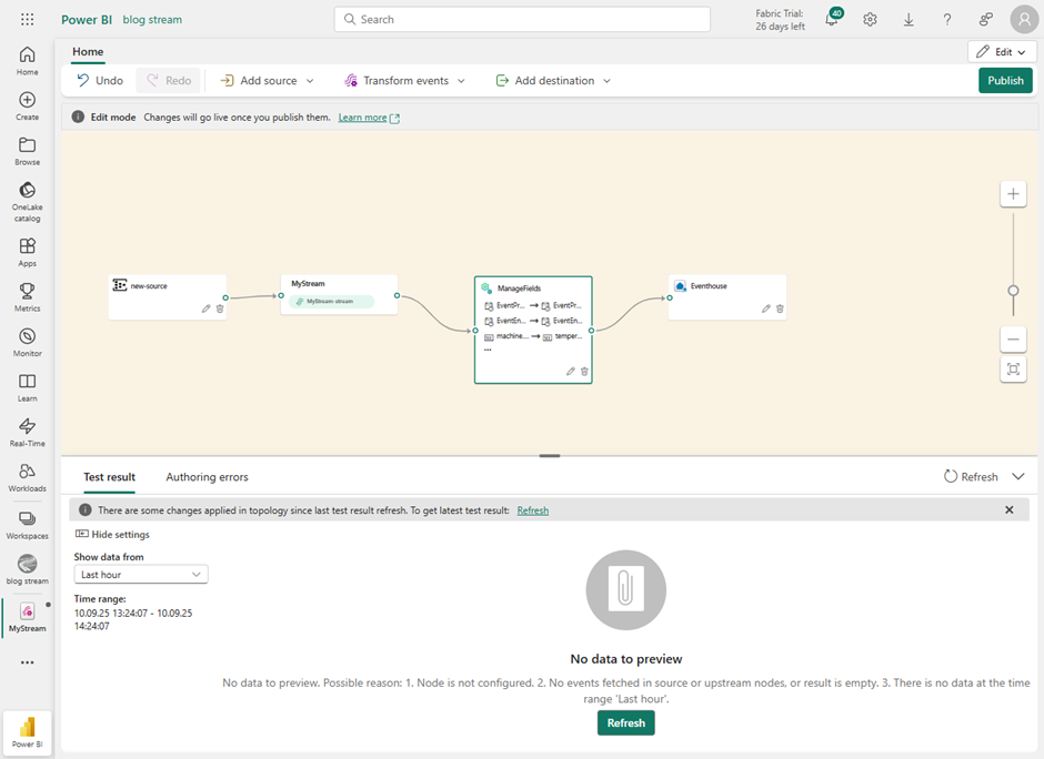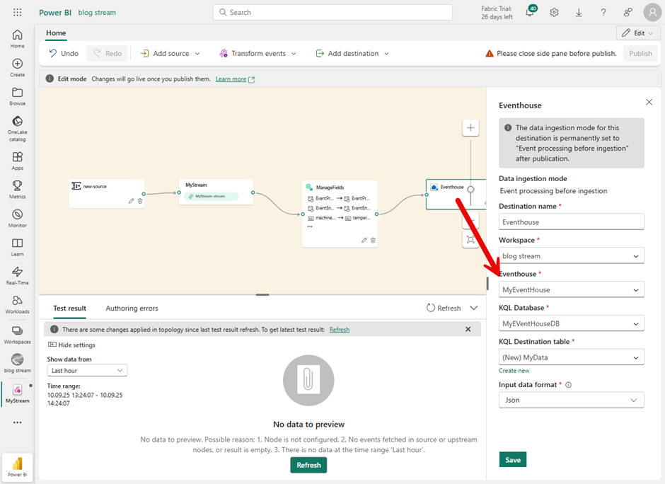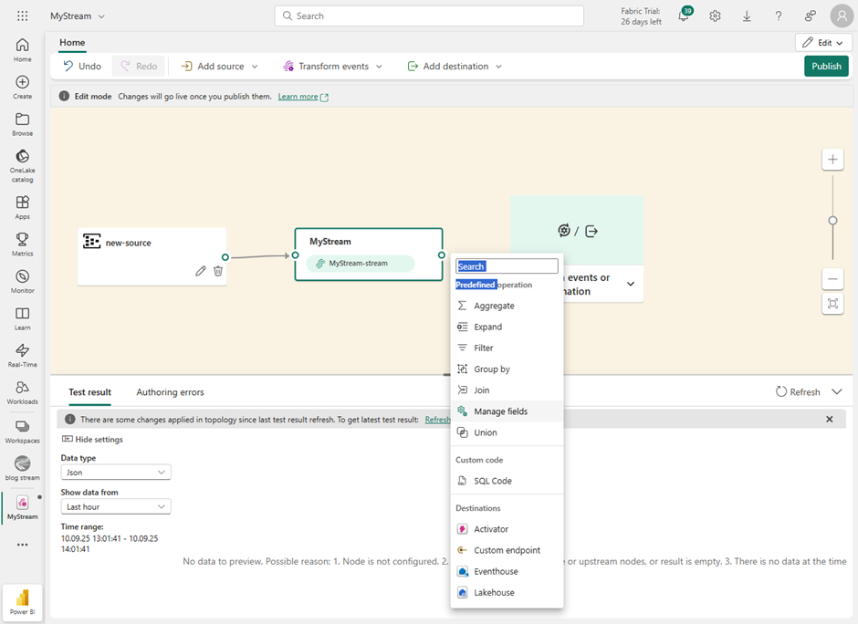 To be able to complete the next steps smoothly, it is recommended to publish this data flow. Otherwise, some functions, such as expanding hierarchies within JSON structures, will not appear fully. You will then have to switch back to edit mode.