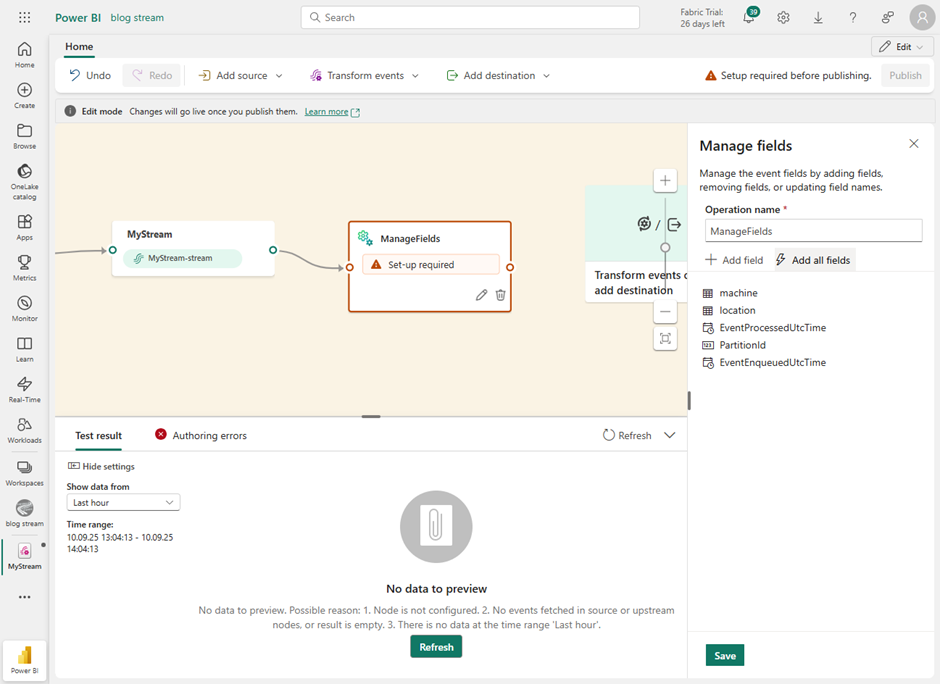 Now you can add a new field from the hierarchy structure. Finally, I added a data sink, in the form of an event house.