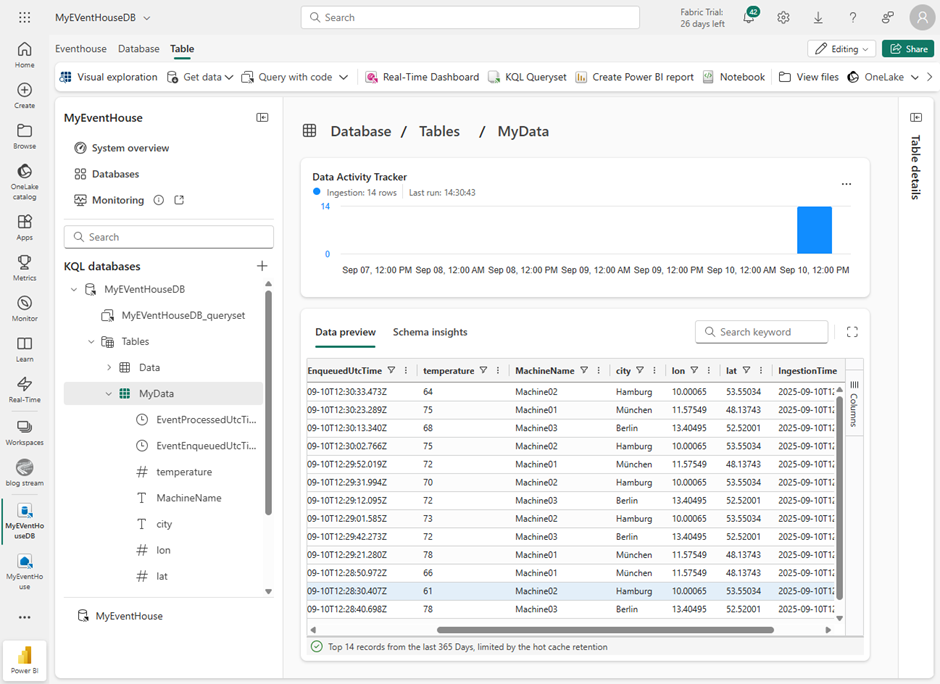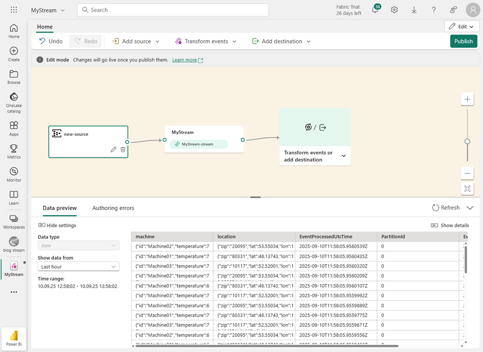 I believe that in a productive environment during development it makes sense to transmit a similar or even identical JSON structure. This way, the metadata can be leveraged to automatically create the table within the Kusto database, as well as to define all other ETL steps within the dataflow in Fabric Real-Time Intelligence.