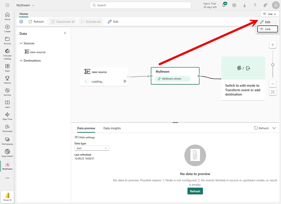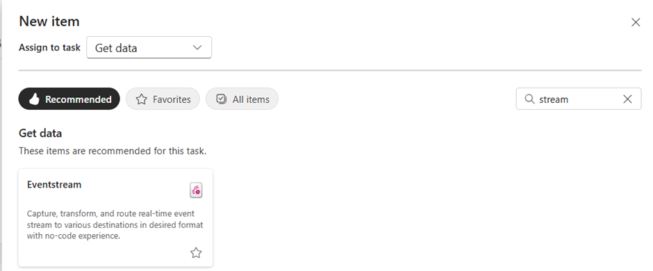I have now created a Fabric Event Stream to capture and process the data from the Azure Event Hub within Fabric.