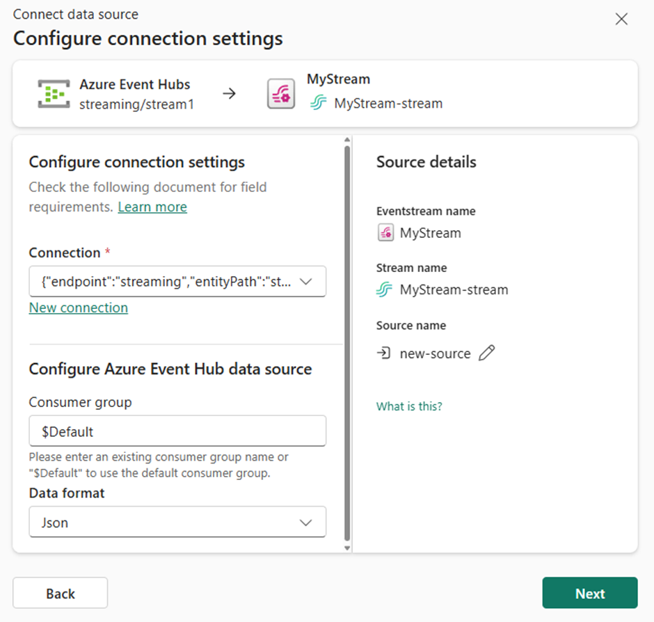 Then I connected this, for the data source, to the Azure Event Hub.