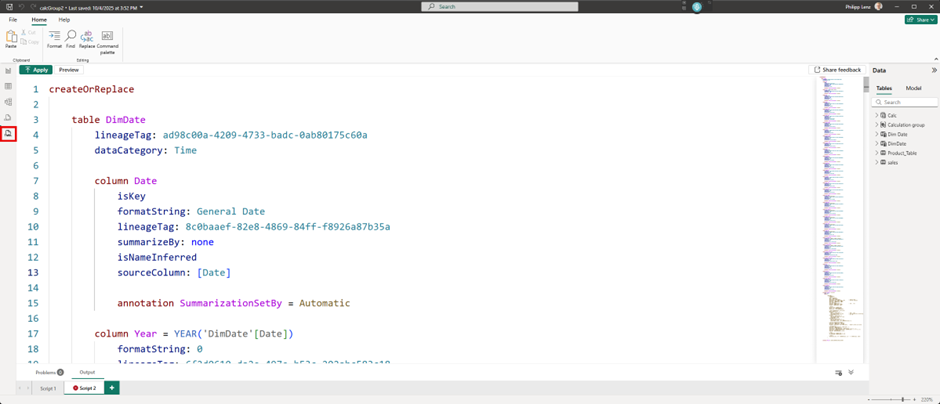 The script listed below is inserted into the TMDL editor and then executed.